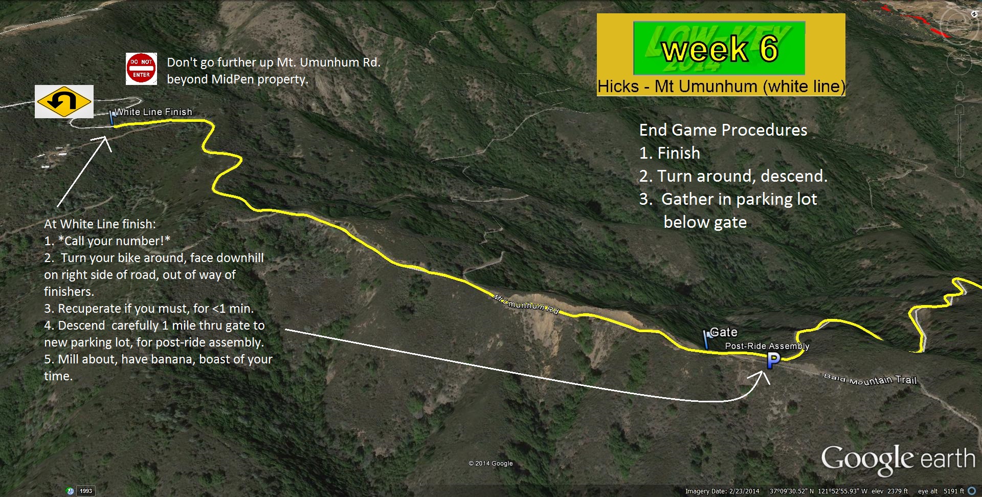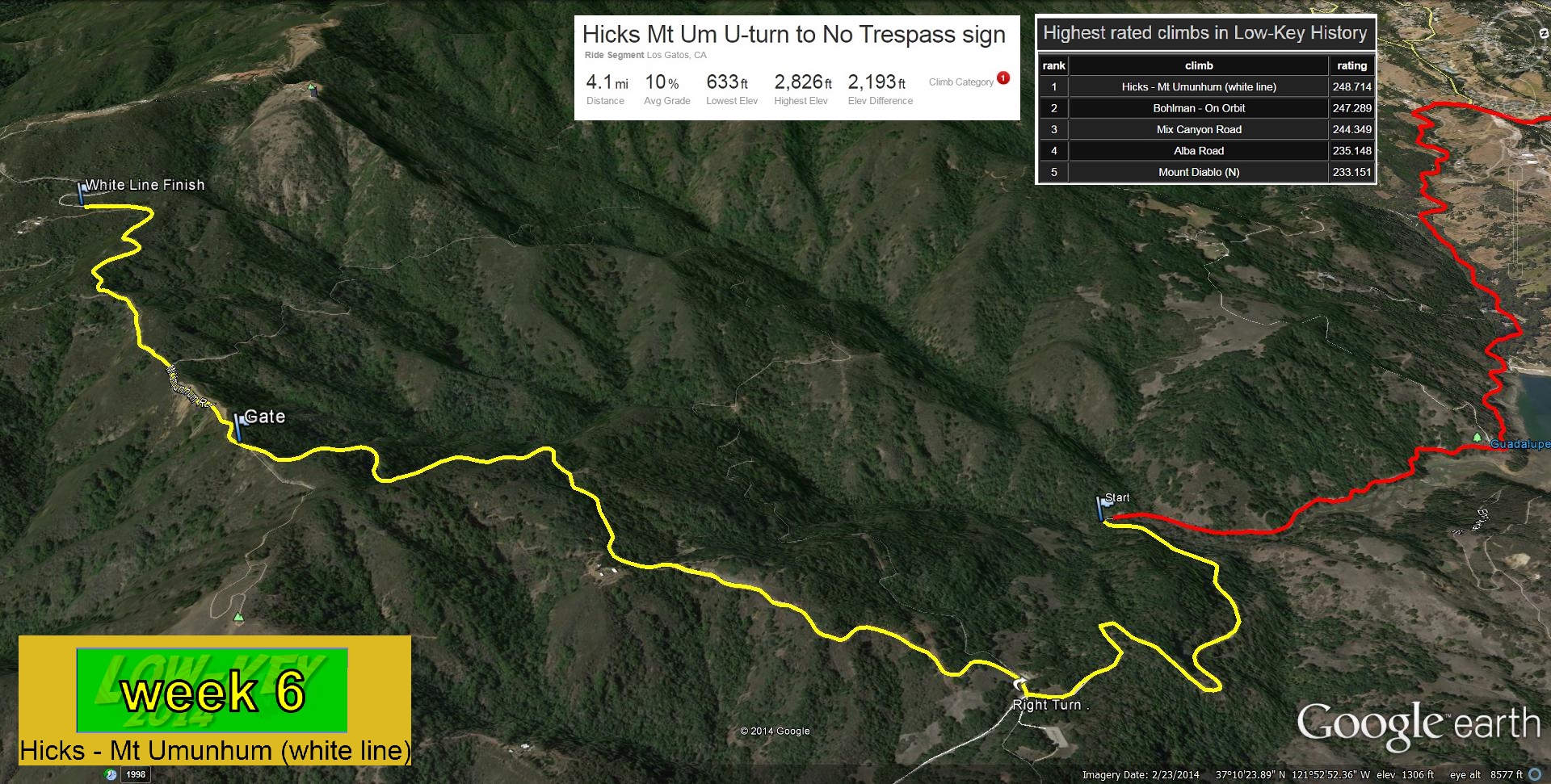 The climb itself: after climbing Hicks we make a right turn on the top of Hicks onto Mt Umunhum Road (Loma Almaden). This we follow up to and through the gate, then on from there to the infamous White Line of Death. Beyond the line? Any who have ventured forth and returned are likely too scarred to tell the tail. In any case, nobody will be doing so today because we are Low-Key and as Low-Key we want to be gracious guests of those who live on the roads we enjoy.