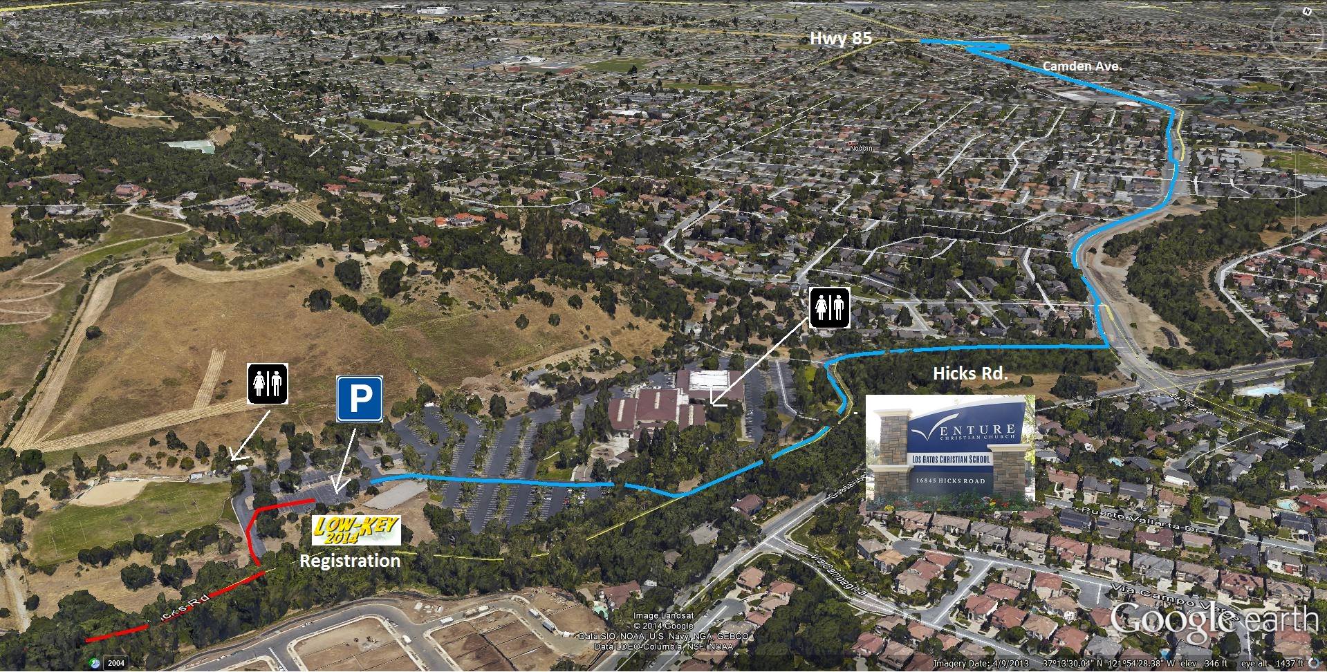 For those driving (blue line), most will take Hwy 85, and then Camden Ave to Hicks Rd. Drive past the first entrance, and enter past the Church. Go through the school lot to the distal lot. There we will have registration. Bikes will exit the lot down the hill to Hicks for the ride to staging. — at Venture Christian Church.