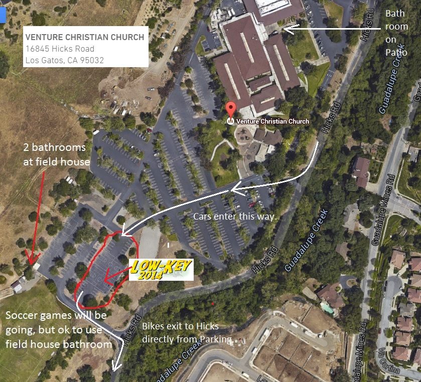 For LKHC Week 6, Hicks - Mt. Umunhum, the registration will be at Venture Christian Church (map). We'll use the closest lot to Mt. Umunhum, off HIcks. They'll be a soccer game going, but we can use the two fieldhouse bathrooms. There's also bathrooms off the patio up the stairs towards the church entrance. The idea will be for cars to enter through the lot, and bikes to exit to Hicks from the Registration lot. — at Venture Christian Church.